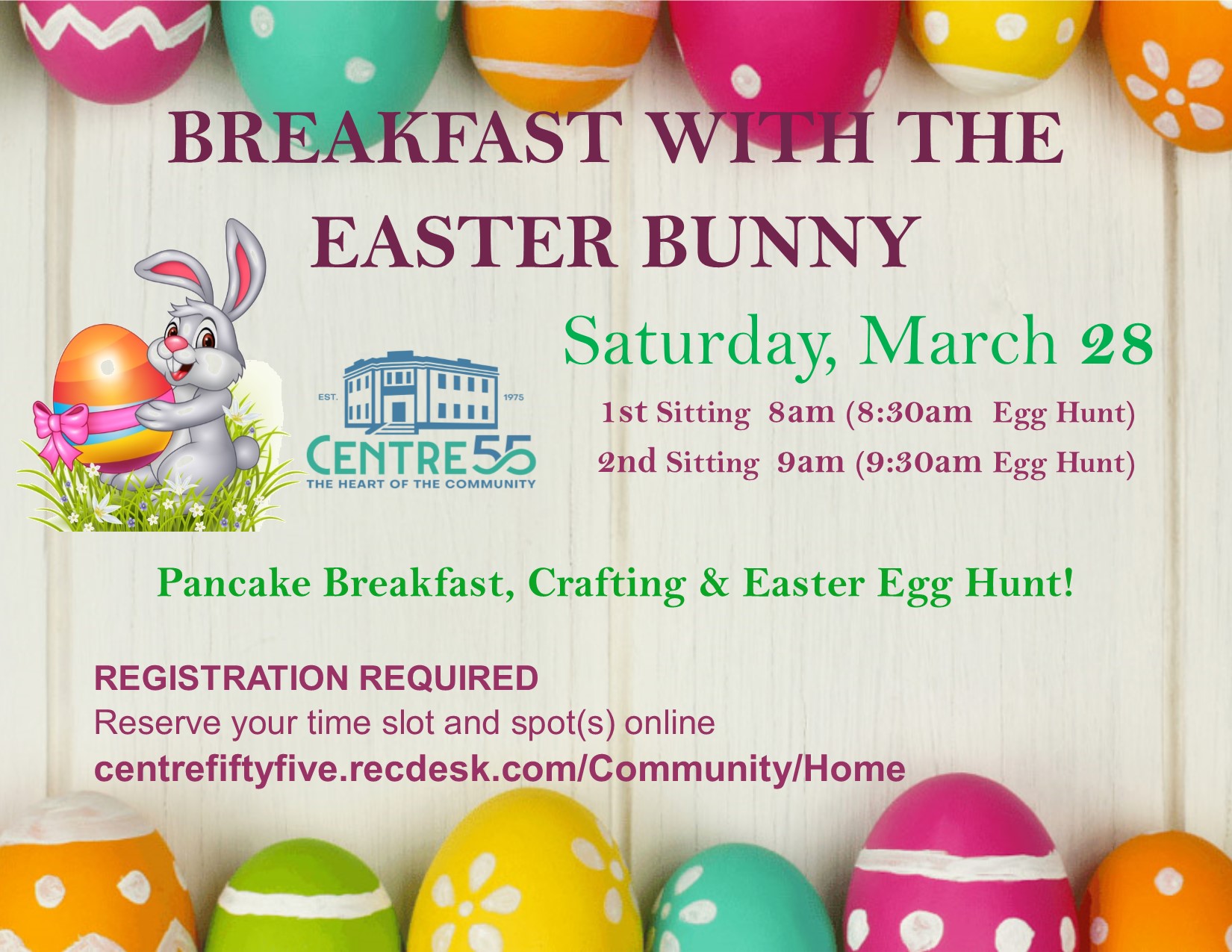 There will be 8AM & 9AM pancake breakfast seatings, with a chocolate egg hunt in Centre 55 to follow each seating. Online registration opens at 9am on March 6th
