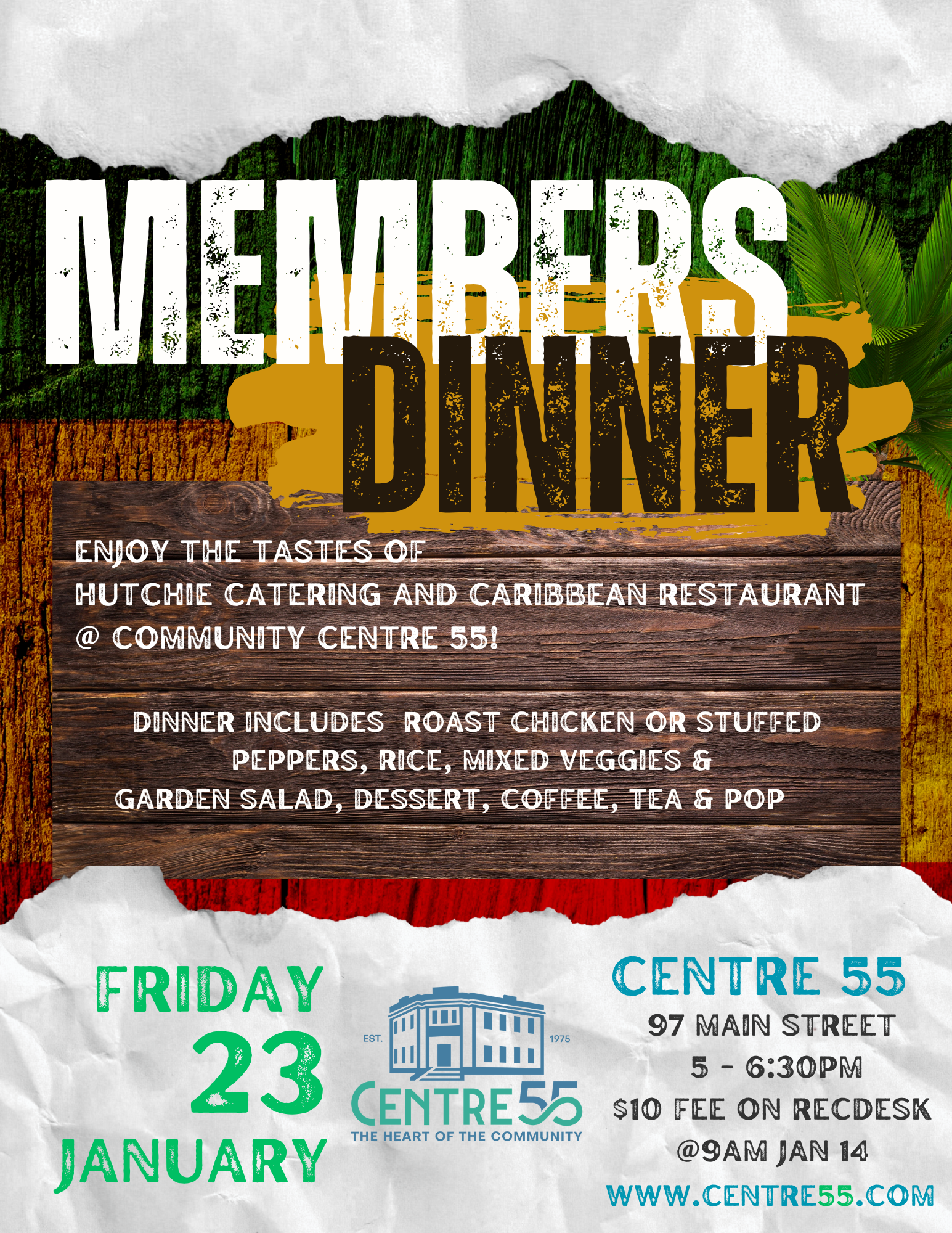 The menu from Hutchie Catering will feature Caribbean cuisine including roast chicken or stuffed peppers, rice, mixed vegetables, salad, dressings & sauces, dessert, pop, coffee & tea. The seating is for 5PM at Centre 55.