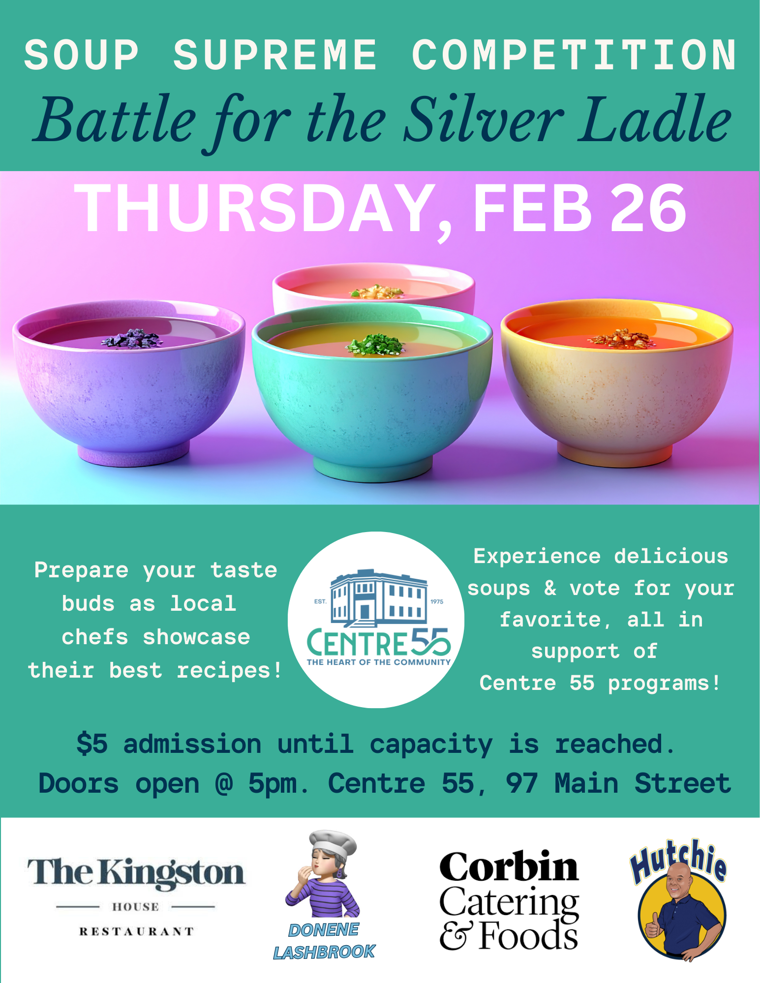 Prepare your taste buds as local chefs showcase their best recipes! Experience delicious soups & vote for your favorite, all in support of Centre 55 programs. $5 admission at the door until capacity. Doors open @ 5pm.