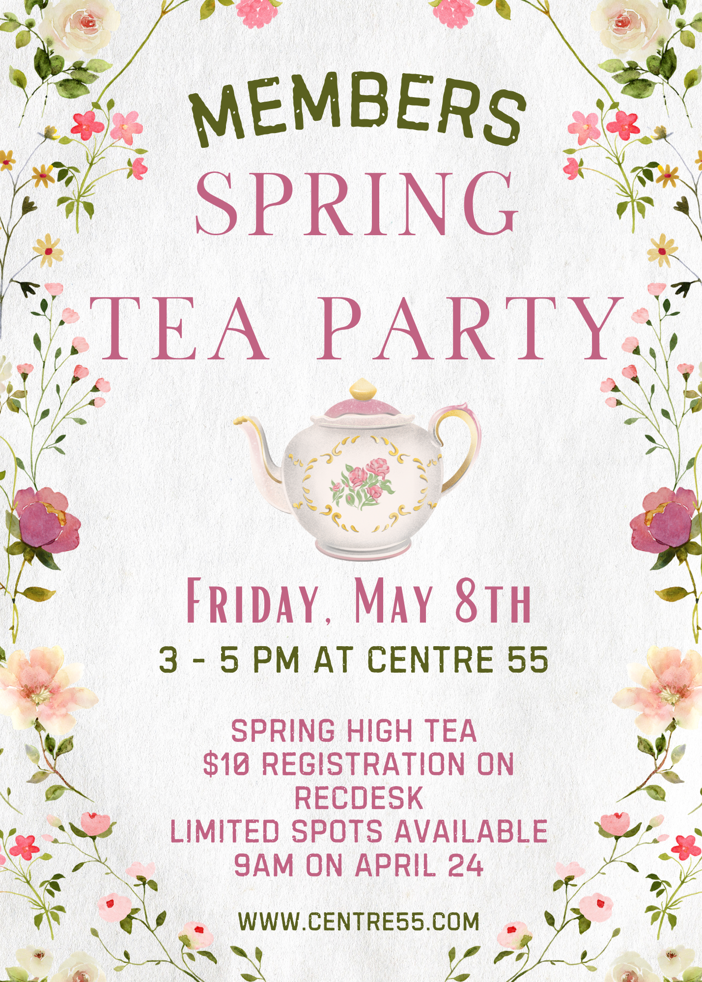Our Spring High Tea will be held on Friday, May 8th at 3PM at Centre 55.