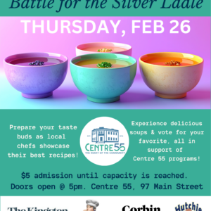 Soup Supreme Competition Join us for Centre 55’s annual Battle for the Silver Ladle! Prepare your taste buds as local chefs showcase their… 26 Feb 5:00 pm - 7:00 pm