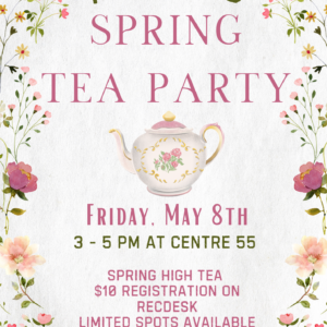 Spring High Tea Our Spring High Tea will be held on Friday, May 8th at 3PM at Centre 55. Enjoy scones, tea sandwiches, tasty… 08 May 3:00 pm - 5:00 pm