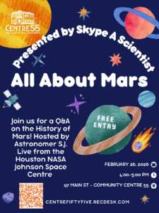 Supported by Skype A Scientist, Join us for a informative presentation + Q&A on the History of Mars! Hosted by Astronomer and Research Scientist S.J. live from the Houston NASA Johnson Space Centre.