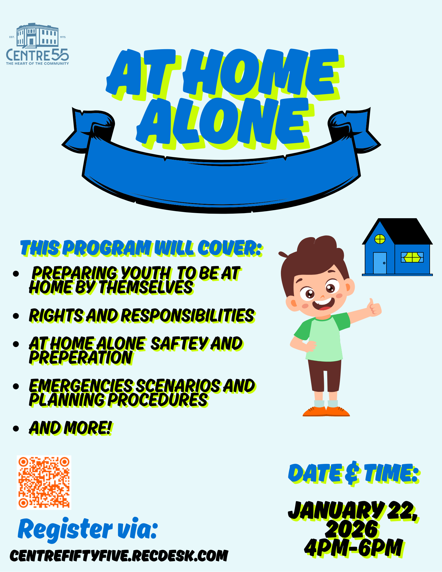 This workshop teaches children the basics of staying safe when they are home alone. From emergency procedures to household hazards, kids learn how to handle situations responsibility and calmly. This 2 hour workshop is designed for kids ages 9- 12 yrs.