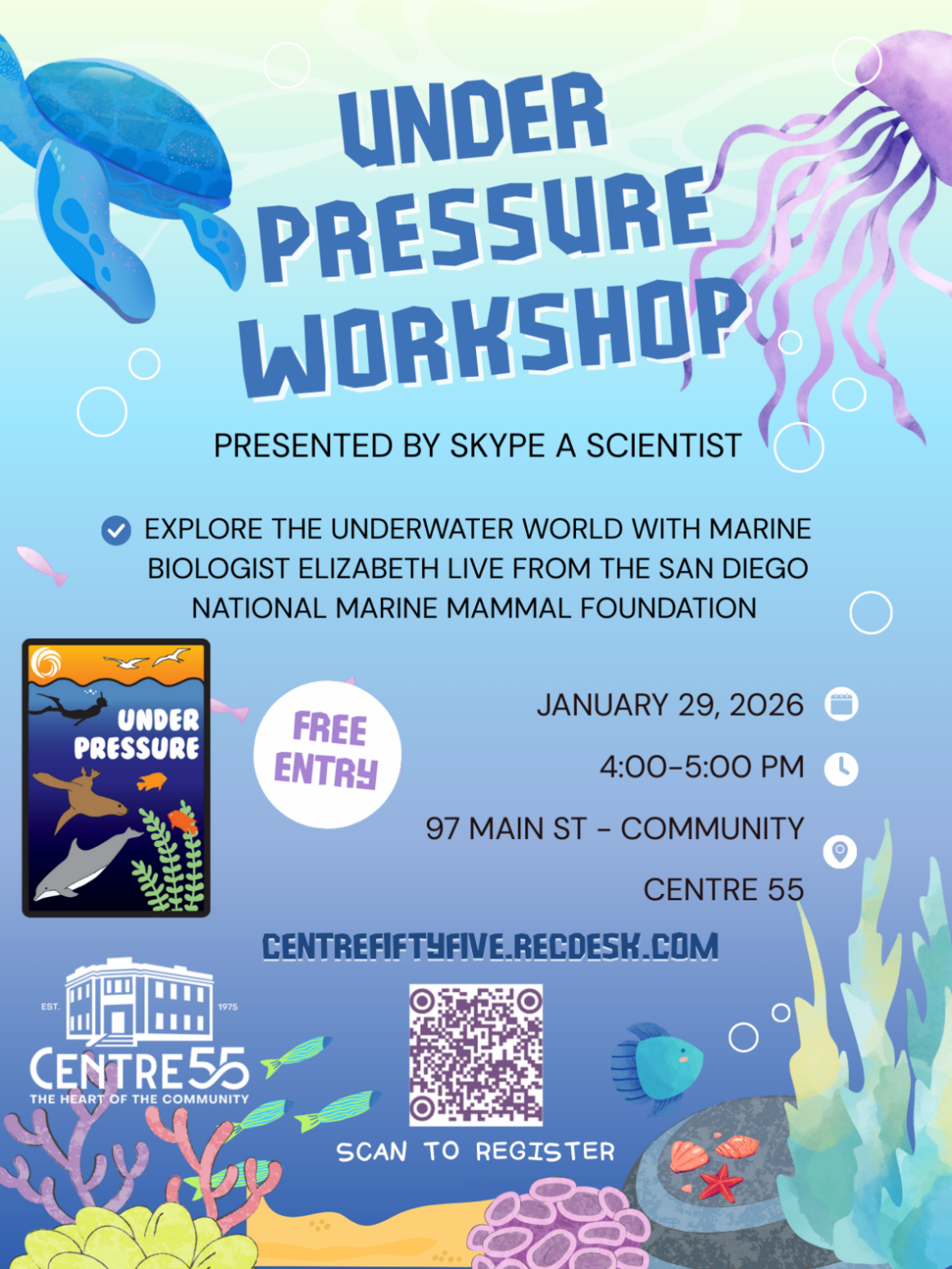 Supported by Skype A Scientist, join us in exploring the underwater world with Marine Biologist Elizabeth live from the San Diego National Marine Mammal Foundation! This workshop is not only intended to educate the community on the impressive diving adaptations of marine mammals and introduce young people to the underwater world, but also to address the conservation issues of marine mammals, their application to humans, and how each of us can protect our shared oceans. (NMMF)